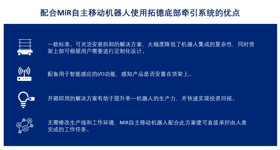 拓德底部牵引系统现已于MiRGo平台上线,更多有关该解决方案的详情,请点击阅读原文。关于MiRGo的更多信息,请访问:mir-robots.com。