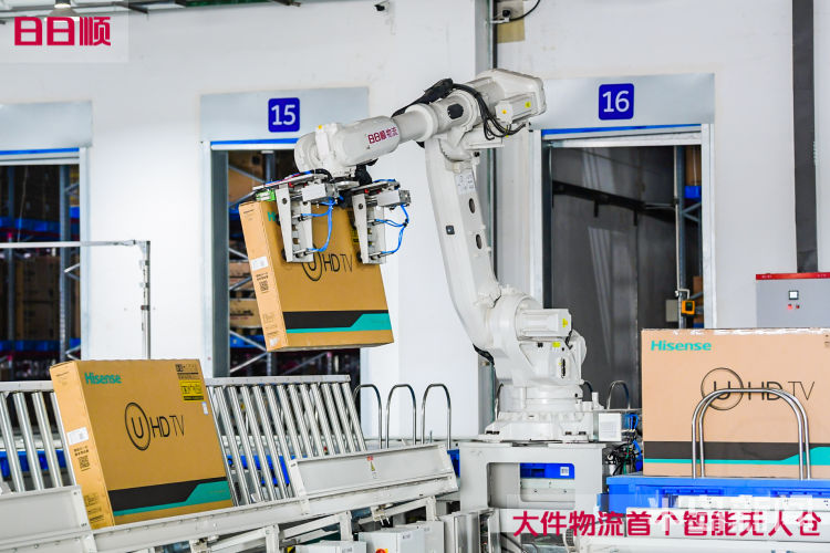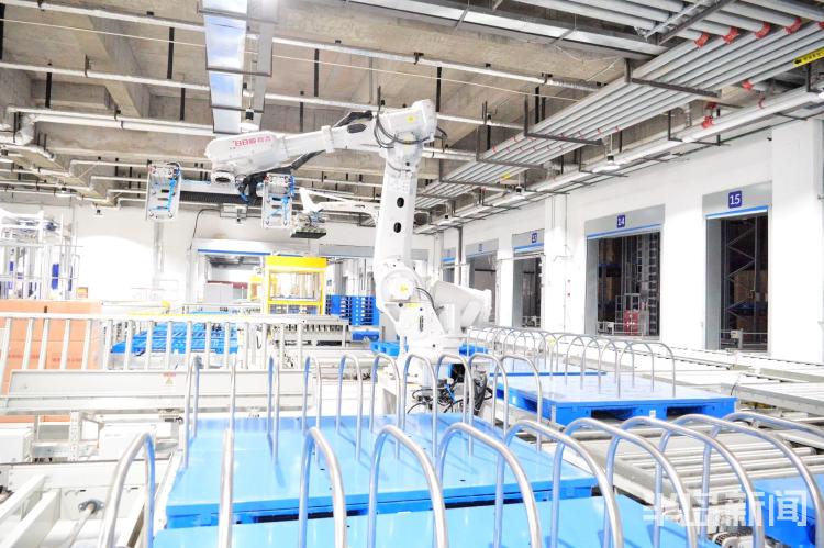 该项目总占地238亩,总投资4亿元,仓库总面积7.8万平方米,主要分为大件平面仓、高架仓、智能AGV仓、全品类无人仓4个部分。其中,全品类无人仓占地20亩,建筑面积1.8万平米。在日日顺智能仓储中心,记者看到用户选购好的宝贝要经历扫描入库、货物码垛、智慧仓储、货品分拣、自动化运输等程序,而进仓并不是一件简单的事,以前是人工扫描入仓,而现在全部采用数字智能化扫描,号称“鹰眼侦察兵”的全景扫描技术,为这些大家伙们进行全景扫描,完整获取产品图像和各项数据,同一天有2.4万件大宝贝一起扫描入库比人工扫描效率高80%,这就是数据智能化。信息自动采集之后要怎么进仓?当然是机器人搬运,在这里系统根据大家伙们的扫描尺寸自动匹配关节机器人进行码垛作业,“身怀绝技”的机器人能够实现动作起落间自主避障,安全准确地将产品放置对应托盘,从流水线搬运到码垛完成用时仅10秒钟,单台机器人最大可以提起450公斤重的东西。