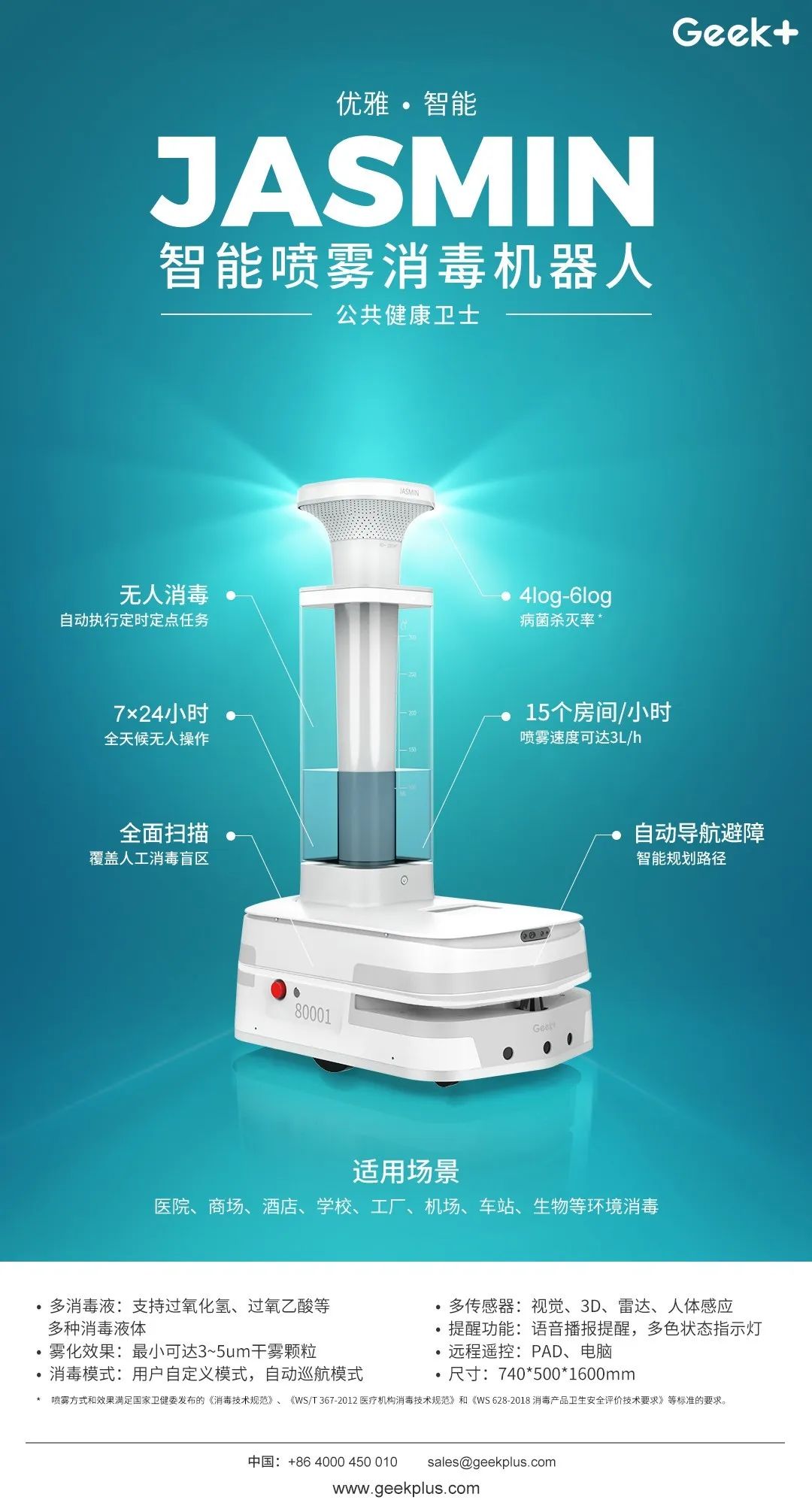 该机器人同样具备精准导航,适应各种复杂环境;电脑、手机、平板多终端远程控制触摸屏可视化操作;无人消毒7x24全天候使命必达等优势,凭借喷雾细腻均匀,杀菌速度快、效果好的特点可广泛应用于医院、商场、酒店、学校、工厂、机场、车站、生物等场景和领域。