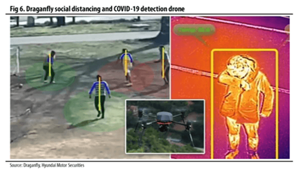 各国政府和企业正在利用这次危机作为一个独特的机会,来实施自主无人机运载能力,以应对当前和未来可能更致命的流行病。无人机现在正在进行不间断的巡逻,通过40倍变焦相机和其他类型的传感器来观察地面情况。警方通过车载扩音器识别并驱散人群和那些在公共场合不戴口罩的人。目前,无人机每天都在进行广播安全任务通知,这使得政府能够向比传统扬声器传播更大的区域去传递信息。无人机也被用于在公共场所喷洒消毒剂。与其他方法相比,无人机可以避免直接接触潜在的危险表面,特别是在那些需要定期消毒的地方。安装了热感摄像机的无人机被用来测量体温和识别有感染冠状病毒风险的人。