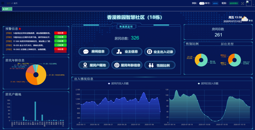 灵至“智慧社区”系统可通过对房屋平米的计算结果限制每个房屋居住人数;可按照地域、男女、自住租借、小区以及每幢楼的情况进行统计查询;可通过人员的出入记录来分析人员进出社区的高峰时间段。在“智慧社区”数据大屏上能直观地显示出小区住户性别、居住类型、居民年龄段的比例,还能显示出各楼居民的预警信息及处理情况。通过“智慧社区”系统,对小区的人员情况尽数掌握,在打击违法犯罪、治安防控管理、服务群众等方面起到了积极作用。