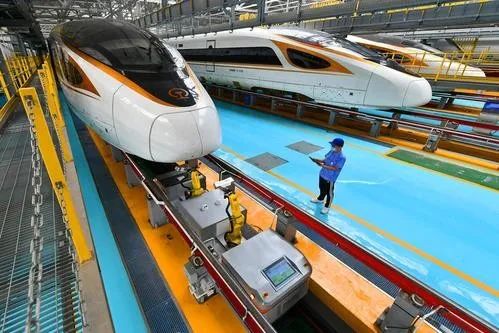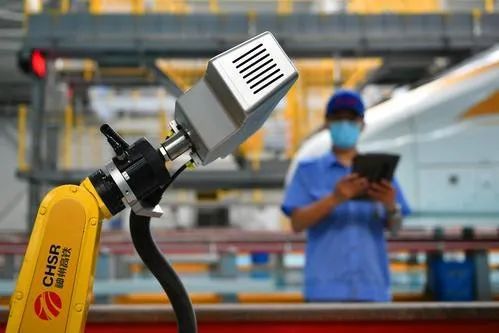 7月13日21时43分,智能型复兴号动车组缓缓驶入北京动车段北京北动车运用所D21-2股道。动车组检修人员张可欣手拿手持终端,走向复兴号动车组。一个黄色屈臂、全身荧白的智能检测机器人在动车组2位侧地沟内停留待命。