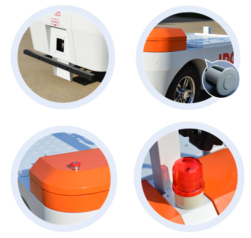 机器人采用四重安全防护措施,包括声光、避障传感器、机械防撞装置、急停按钮,以确保安全。