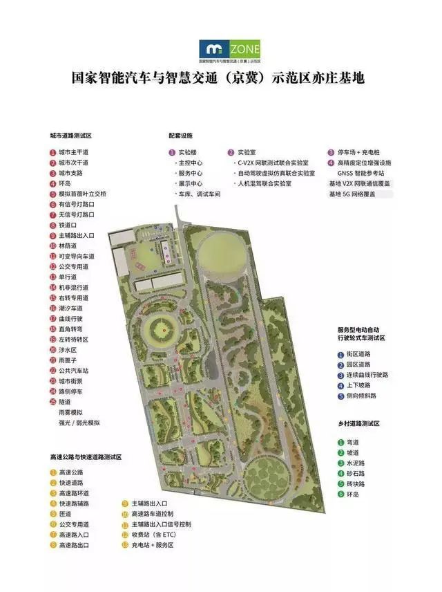 亦庄测试基地模拟的是华北地区的道路状况,除了可提供常见的测试场景外,还可提供隧道、雨雾、模拟光照、湿滑路面、收费站、服务区、铁路道口等场景,支持12米以下自动驾驶车辆能力评估T1-T5的全场景测试。