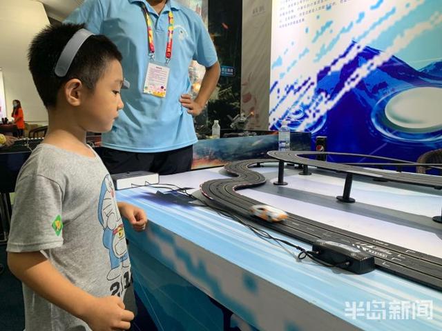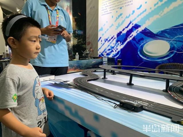 进入公园内,在一个展台前一位小朋友正戴着一个类似头箍的电子装置,眼睛盯着展台上的小汽车,小汽车在小朋友的注视下,沿着跑道快速行驶。