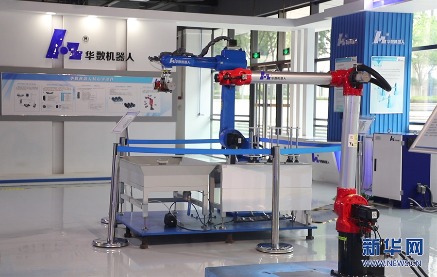 在工业机器人展区,ABB、川崎、发那科、华数等国内外知名机器人企业悉数亮相。图为华数机器人展区。新华网发(吴月浩 摄)