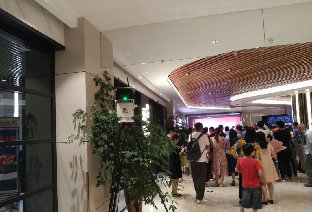 在电影院的入口处,深兰科技AI热感视觉行为监控摄像仪-猫头鹰在对进出人员测量体温,通行人员无需停留便可以轻松测温。一旁电脑会显示测温数据,如有异常体温,可进行快速预警,工作人员将进行二次筛查。