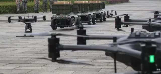 物资筹措组操作无人机组成无人机编队迅即升空四台无人车组成的无人车车队也在警戒人员的护送下前往前接位置到达前接位置后无人机投放烟雾弹进行掩护两名战士身穿外骨骼装置将几百公斤的物资搬运到无人机及无人车上任务完成后大家迅速隐蔽返回