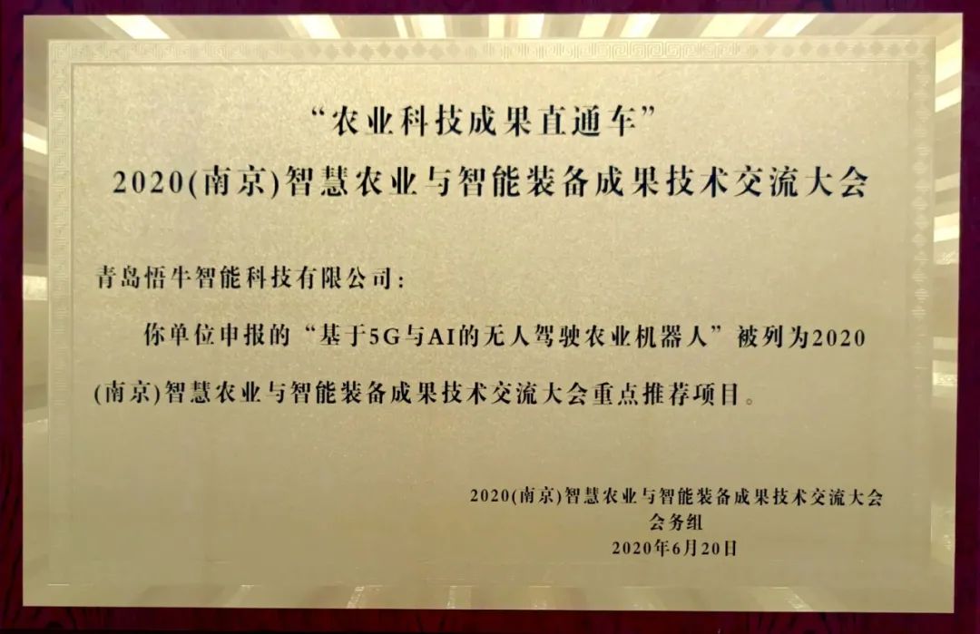 悟牛智能未来农业可持续生产解决方案彻底解决了赵春江院士提到的智慧农业发展过程中存在的问题,契合会议主旨讲话精神,经过由中国农业国际合作促进会、国家农业信息化工程技术研究中心、国家农业智能装备工程技术研究中心、国家智慧农业科技创新联盟等单位组成的组委会的推荐和评议,悟牛智能“基于5G与AI的无人驾驶农业机器人”被列为2020(南京)智慧农业与智能装备成果技术交流大会重点推荐项目。