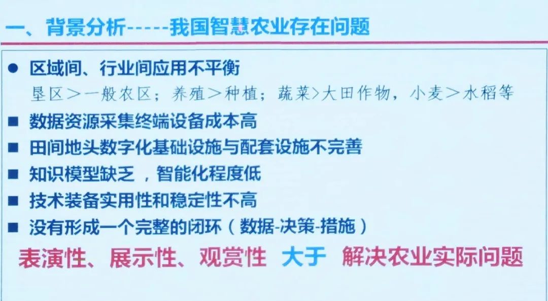 8月19日,南京国家农创园首位引进的院士、农业信息化专家、国家农业信息化工程技术研究中心主任赵春江在大会主旨报告中明确指出:我国智慧农业发展中存在表演性、展示性、观赏性大于解决农业实际问题的现象。