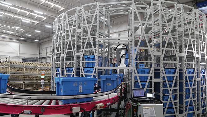 意欧斯自动化仓库是利用机器人机械手以料箱为存储单元,在料箱环形圈内进行360°的旋转分拣货物。相对于其它仓储方式,机器人料箱式自动仓库可以使用容器、箱子或货架来储存小部件,能够充分利用货架的空间高度,提高存储空间利用率;机器人料箱式自动仓库利用在托盘、货架上安装的RFID电子标签,使机器人手臂在进行存取、拣选货物时,可缩短单件货物的拾取时间,降低错误率,节省存储货物的时间成本和人工成本,从而实现自动化仓库较高的转运效率。