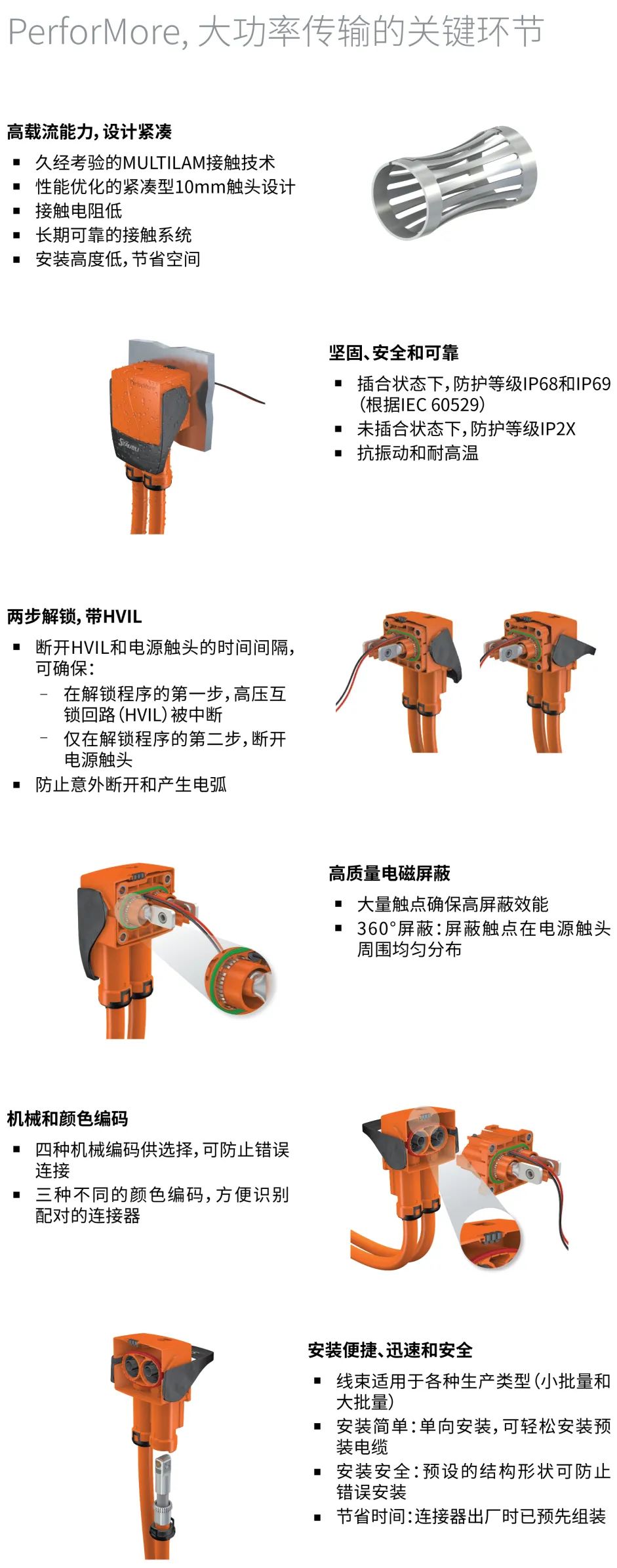 紧凑型的设计,能够为开发人员提供最大可能的灵活性。得益于久经考验的MULTILAM表带触指技术,PerforMore的载流能力高(在85℃环境温度下高达400A),且具有高抗振性。HVIL两步锁紧装置和高质量电磁屏蔽,提高了用户操作的便捷性和安全性。