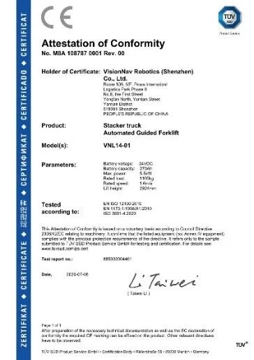 未来机器人(深圳)有限公司于近期获得了符合2006/42/EC欧盟机械指令和ISO 3691-4:2020最新国际标准的无人驾驶工业车辆CE证书,这也是自ISO 3691颁布后,TUV南德颁发的全球首张无人驾驶工业车辆CE证书。