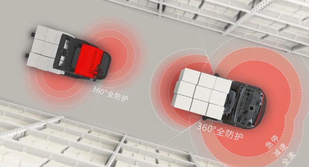 未来机器人无人叉车基于视觉SLAM技术,运用先进的底层算法和运动控制,满足大部分高精度作业需求。其严格遵循国际安全设计标准,每台车配备两台西克nanoScan3安全扫描仪用于全方位360°激光避障及安全防护,同时配备Flexi Soft安全控制器,全面保障人、车、货的安全。