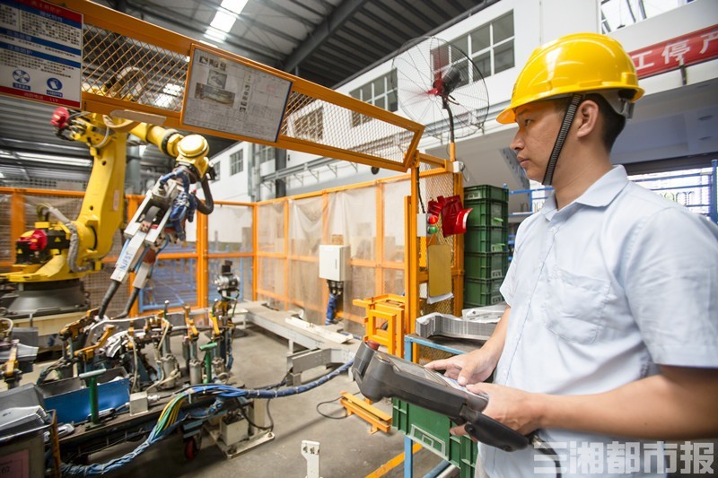 在长沙晓光模具公司的冲焊工厂,毛逢春熟练地在手持设备输入一串串指令代码,控制面前的机械手臂灵活抓取生产线上的毛坯料,秒变机器人“24小时全自动搬砖模式”,时而“低头”、时而“摆臂”、时而旋转“机身”。通过工业机器人在流水线上的协同工作,他轻松完成汽车部件流水槽焊接、加工等工序,整个过程行云流水、一气呵成。