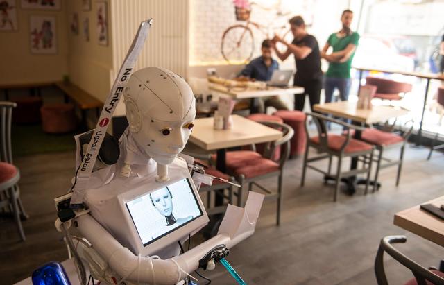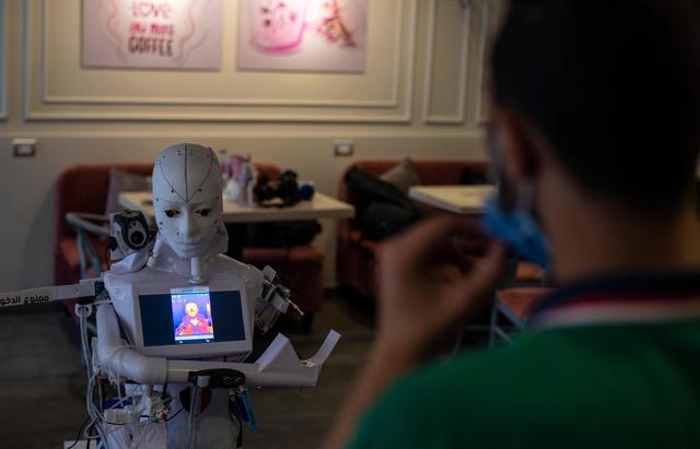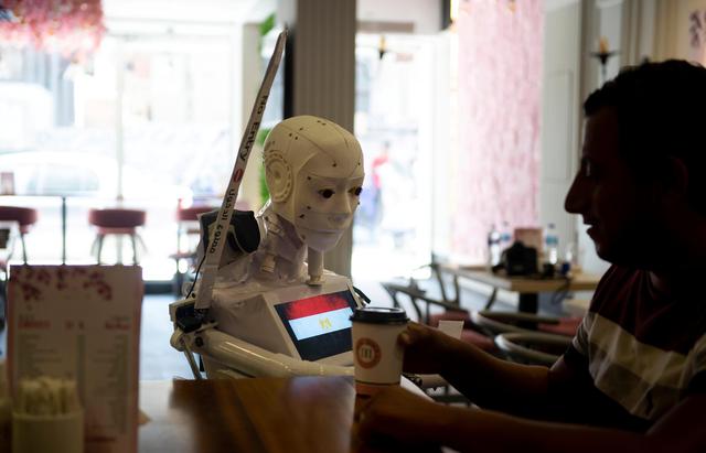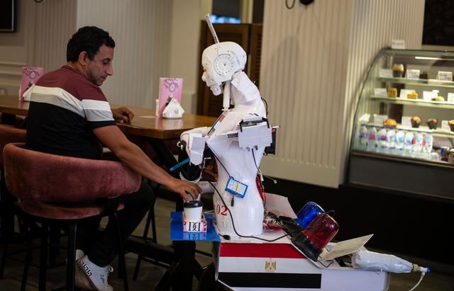新华社照片,外代,2020年8月25日 (外代二线)(4)埃及工程师研发抗疫机器人 8月23日,一台机器人在埃及坦塔为顾客提供咖啡。 埃及工程师马哈茂德·科米研发了该款多功能抗疫机器人。 新华社/欧新