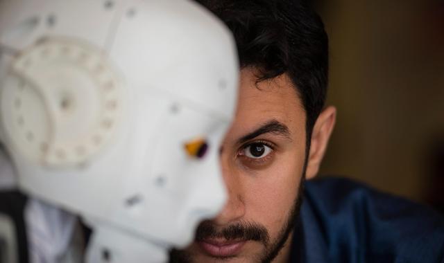 新华社照片,外代,2020年8月25日 (外代二线)(9)埃及工程师研发抗疫机器人 8月23日,埃及工程师马哈茂德·科米在埃及坦塔与机器人合影。 埃及工程师马哈茂德·科米研发了该款多功能抗疫机器人。 新华社/欧新