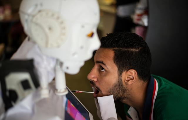 新华社照片,外代,2020年8月25日 (外代二线)(8)埃及工程师研发抗疫机器人 8月23日,一台机器人在埃及坦塔为一名男子进行核酸采样。 埃及工程师马哈茂德·科米研发了该款多功能抗疫机器人。 新华社/欧新