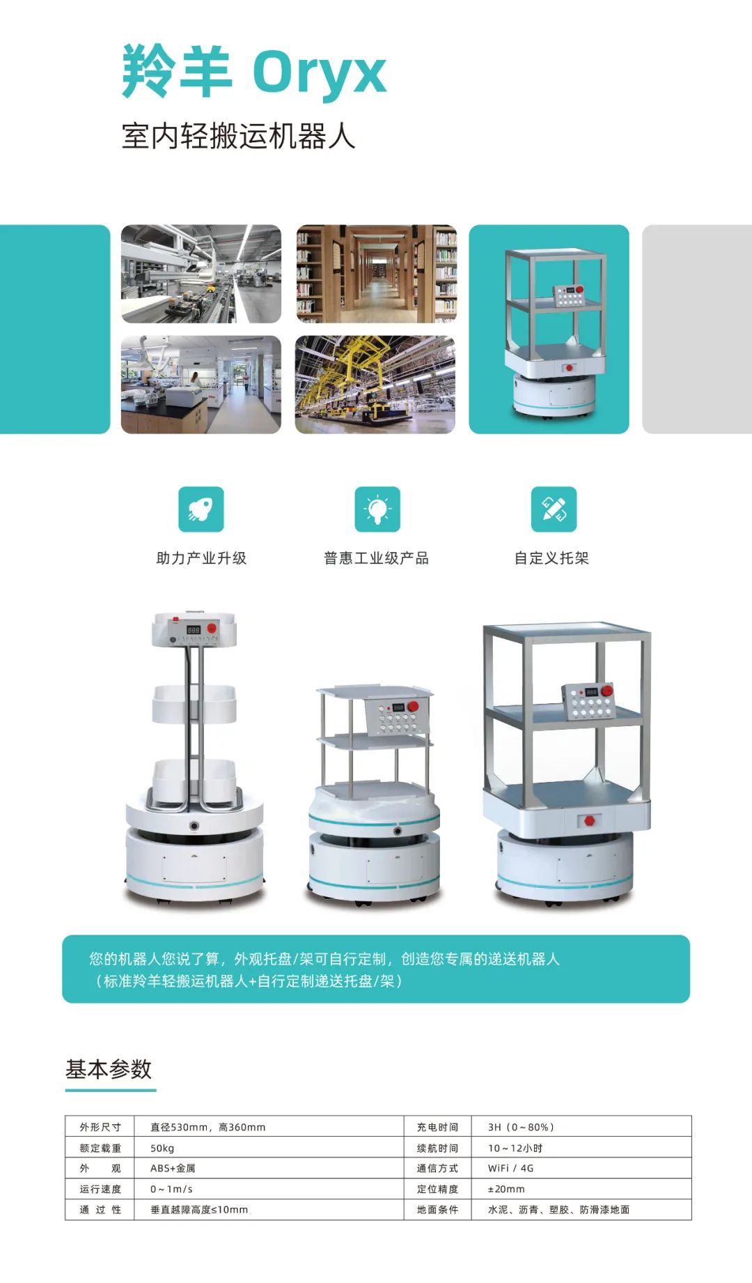 羚羊Oryx轻搬运机器人适用于工厂、实验室、医院、电商仓储、邮政等室内搬运场景,可实现两点间货物的高效无人化递送,特别适合高频次重复作业流程。