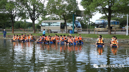 令人激动的时刻到了——扎筏泅渡。每组队员根据教练提供的道具学习如何扎一个结实的竹筏,在保证安全的前提下高效的抢夺每队的队旗并取得高分、夺得名次,这个游戏体现的是一个团队的协作力的考验。队员经过简单讨论,确定目标,分工明确,在规定时间内扎好竹筏下水。