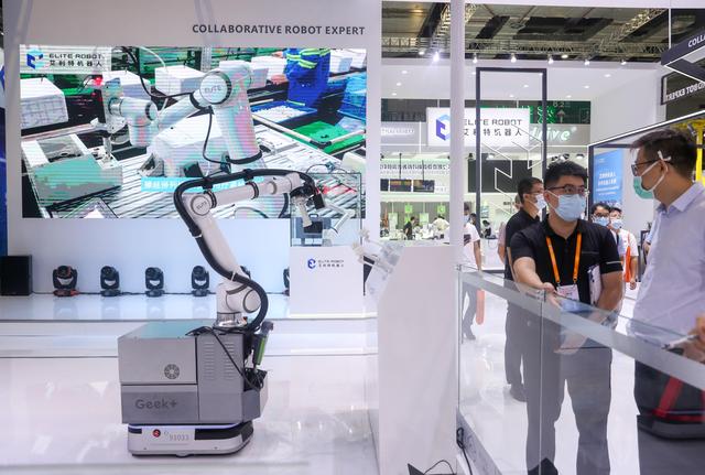 9月16日,观众在展会观看一台“协作机器人”。