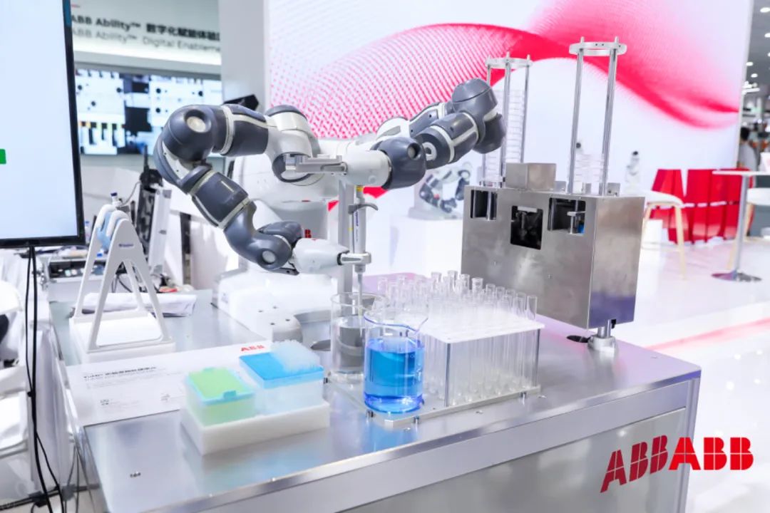ABB展示了一套针对医院的机器人药房自动化系统,以及用于医疗实验室的协作工作站,以展示其对未来医院的愿景。在协作工作站,一台双臂YuMi®能够与实验室人员协同工作,完成移液、分液、混液、微生物培养等任务。