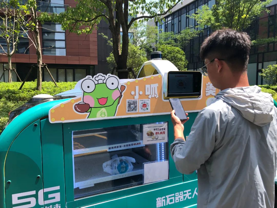 并且作为一款L4级自动驾驶无人车,在购买美食的过程中全部采取无接触模式,朋友们只需在无人车上方的购物触控屏上选择相应的商品扫码支付,相应“橱窗”就会打开,立刻就可以取到选择的美食啦!