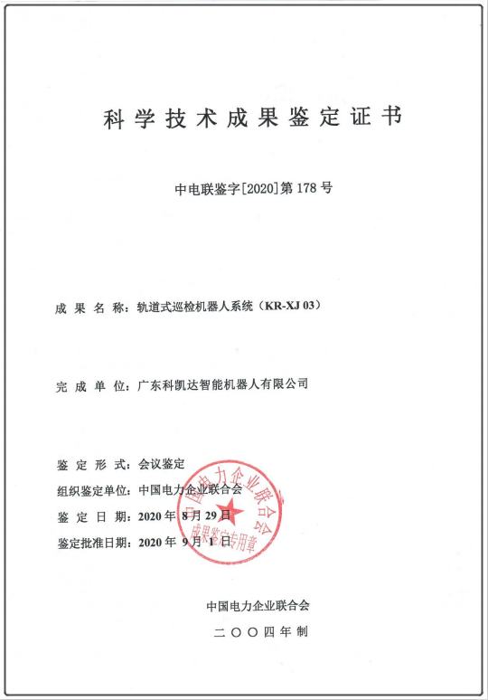 2020年8月,由科凯达公司自主研发并拥有产品全部知识产权的挂轨式巡检机器人,在通过了各项实验测试后,举办了专家评定会,雷清泉院士为主任的鉴定委员会确定该产品居于国际领先水平。