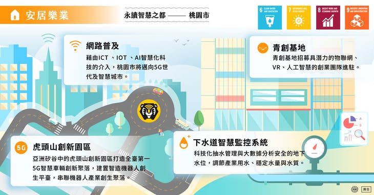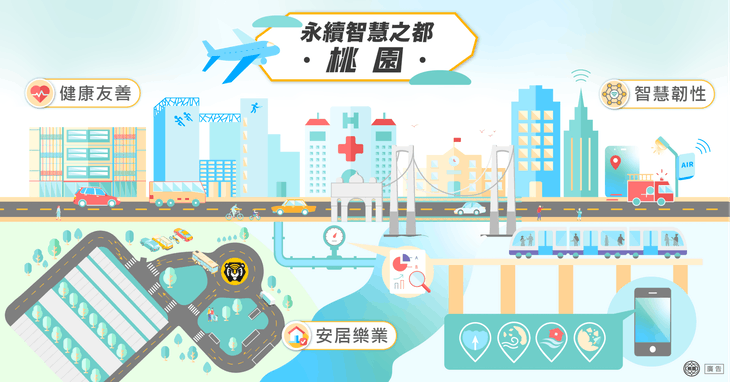 安居乐业:桃园以智慧运用营造优质舒适的居住工作环境,成为宜居、宜业、宜游、宜学、宜养等诸事皆宜的城市,不只提升市民幸福感,也让来就业、就学、游玩的民众能感受桃园市的活力与魅力。