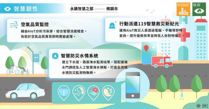 智慧韧性:桃园市政府将智慧科技应用到防灾,并积极推动跨局处计画的低碳绿色城市计画,追求环境永续及强化城市韧性。