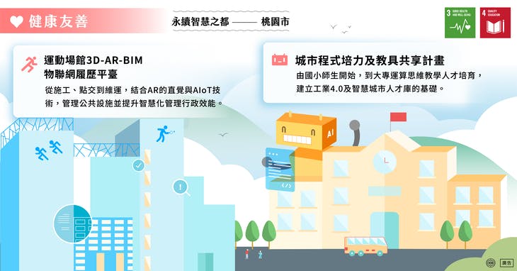 许多地方政府都积极发展智慧城市,究竟「桃园经验」有哪些值得借鉴之处?桃园市以「联合国永续发展目标」( Sustainable Development Goals ,简称SDGs )为核心宗旨推动智慧城市,包括捷运、航空城等重大建设均应用低碳环保、智慧建筑、智慧防灾系统等技术,颇受国际肯定,其中更以「智慧韧性」、「安居乐业」、「健康友善」 3大目标作为发展愿景。