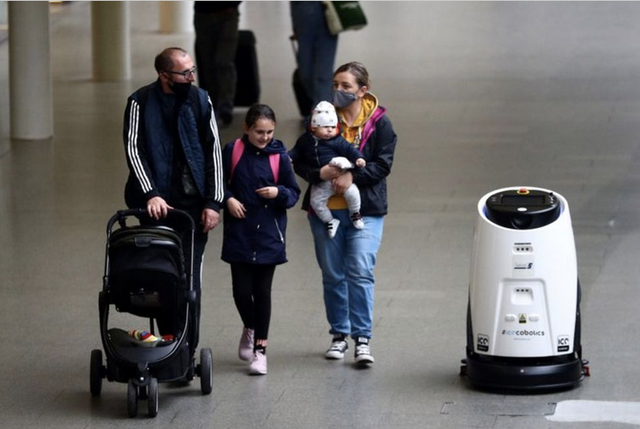 2020年9月23日,一款名为Eco Bot 50的消毒机器人正在清理圣潘克拉斯国际火车站。伦敦最大的火车站之一的圣潘克拉斯国际火车站引进了消毒机器人,试图恢复乘客对于使用公共交通工具的信心。路透社24日的报道援引火车站工作人员的话指出,该消毒机器人将利用紫外线进行大面积清洁,该技术可以在几分钟内杀死物体表面以及周围空气中的细菌和病毒,其中包括新冠病毒。