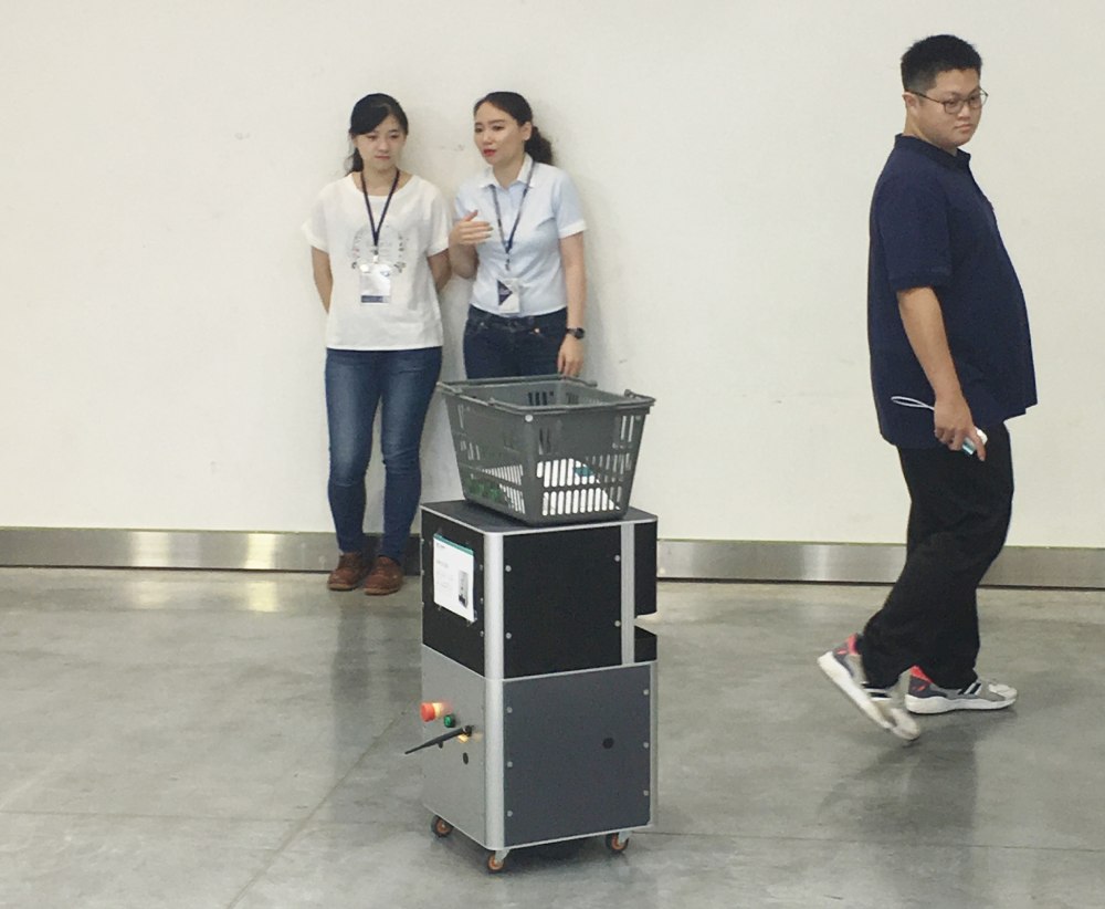 工业技术研究院服务系统科技中心(服科中心)执行经济部计画研发的「无轨无人搬运车解决方案」已获得多项专利技术肯定,服科中心研发的「无轨无人搬运车的导航方法(SLAM )」,此机型可运用于卖场自由移动展示商品,亦可随机播放商场广告,业者欲使用无轨无人搬运车之SLAM技术无需布建任何硬体,且利用机器人推销可吸引消费者目光、达到广宣目的,除此,SLAM技术是透过环境周围物理轮廓进行即时定位与导航,其本身具有避障技术,能自动闪避人群或障碍物,双萤幕与蓝芽喇叭可提高广告播放能见度,设计三层轻型货品展示架可放置促销品等增加消费者拿取意愿。