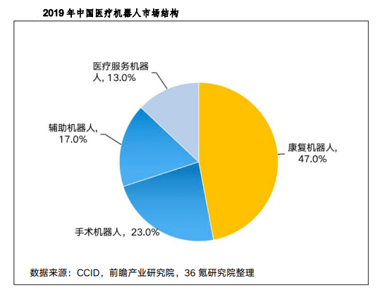 根据国际机器人联合会(IFR)的标准,医疗机器人可分为 手术机器人、康复机器人、辅助机器人、医疗服务机器人四大类型。赛迪智库数据(CCID)统计显示,在2019年我国医疗机器人市场中,康复机器人、手术机器人、辅助机器人和医疗服务机器人分别占比47%、23%、17%、13%。