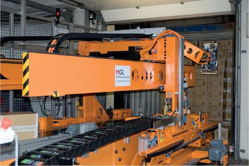 机器人的底盘连接到可伸缩式传送带,传送带将机器人引导至集装箱(20英尺和40英尺),通过图像识别系统和机器人相结合来实现自动装卸。如果所有包裹均不在机器人的工作范围内,则由SCHLEICHER控制器的PLC组件控制的机器人系统会在可转向底盘上移动到最佳位置,并在那里继续装卸。
