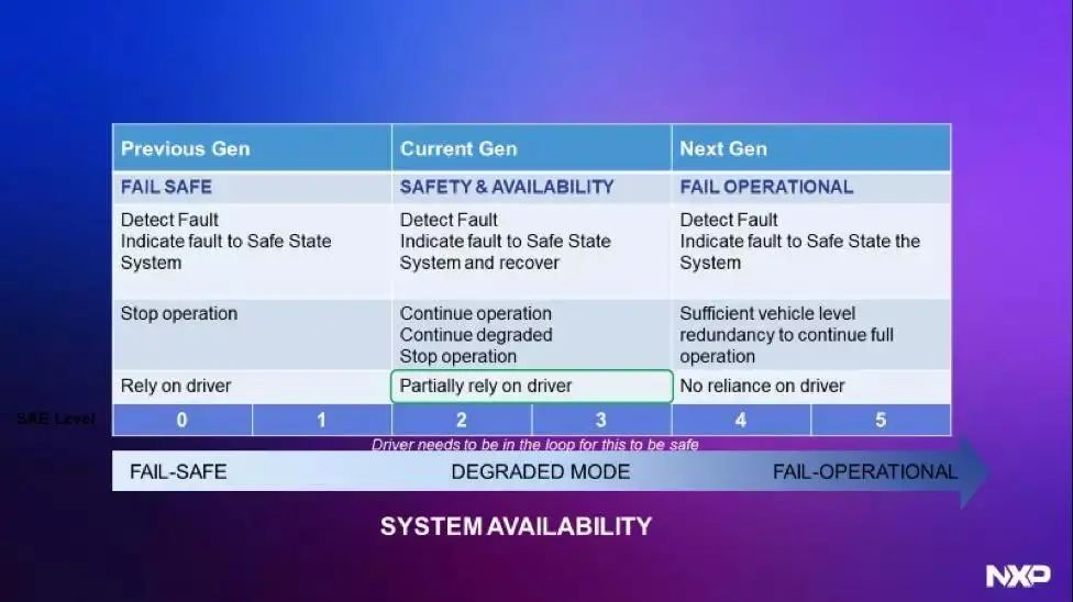 SAE自动驾驶分类较低级别中的大部分辅助功能都是“故障防护”系统,这意味着一旦发生故障,系统将会进入安全模式。在L0、L1自动驾驶功能的情况下,系统依靠驾驶员对车辆继续进行安全操作。在当前的L2和L3系统中,我们期望系统能够具备更高级的可用性,能够识别故障并以降低性能的模式继续运行,仅在部分情况下依赖驾驶员。预计L4和L5系统将可以在发生故障后继续运行,这意味着当系统检测到故障后,系统内置足够的冗余来容错,以便继续全面运行足够长的时间,直到系统将车辆恢复到安全状态。