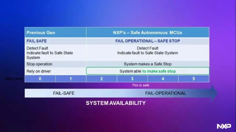 当出现故障时,切换到人类驾驶员是L0至L3系统的一个关键部分。要实现从自动驾驶系统到人类驾驶员的切换,需要进行大量研究工作。Eriksson和Stanton的研究发现,在非紧急情况下,完成切换所需时间从2至26秒不等,如果驾驶员收到切换请求时正在进行其他任务,所需的时间会更长。请记住,车辆在高速公路上自动驾驶时,高速行驶下的速度超过每秒25米。在最快的反应时间下,车辆需要行驶半个足球场的路程才能完成切换,在最慢的反应时间下,车辆则需要行驶将近6个足球场的路程才能完成切换。在紧急情况下,驾驶员的反应会比较慢,并且人类驾驶员可能会做出错误的决策,造成交通事故 (Eriksson & Stanton, 2017)。基于这种情况,恩智浦认为实现安全无忧出行需要L2甚至更高级的自动驾驶系统,才能使其在发生故障后继续运行,至少能够安全停车。