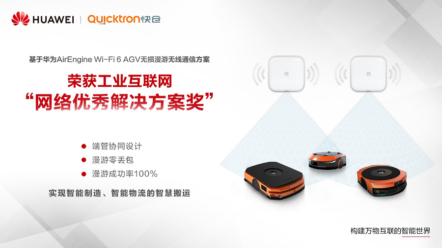 在不久之前的2020工业互联网大会上,华为与快仓联合提交的基于华为 AirEngine Wi-Fi 6 AGV无损漫游无线通信方案,就荣获了“工业互联网网络优秀解决方案”奖。该奖项的评委会由工业互联网联盟组织,包括中国信息通信研究院、权威专家学者及先进企业代表组成。评委会基于方案的创新性,方案价值、方案落地使用效果等进行全面评估,从众多候选方案中选出最优秀的创新方案,推荐给行业的客户。由此可知,"工业互联网网络优秀解决方案"奖项是本届大会最有含金量的奖项之一。