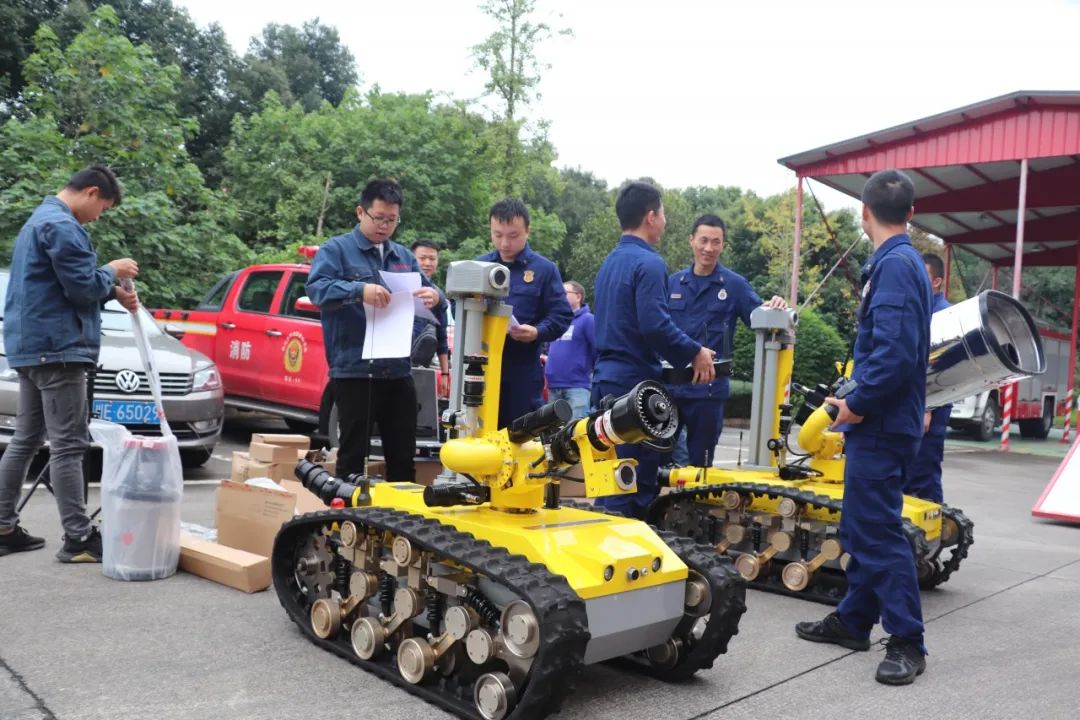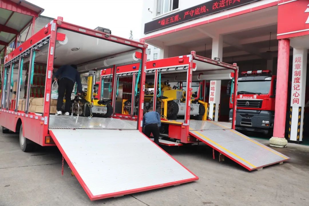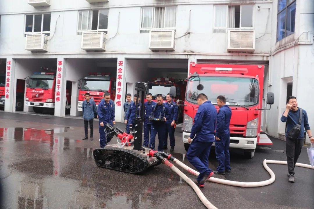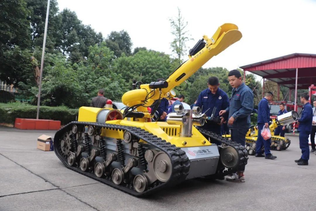 下午交付列装至泸州市江阳区海普路消防救援站的3台消防特种机器人分别是:1台防爆消防灭火侦察机器人(RXR-MC80BD),1台防爆消防中倍数泡沫灭火侦察机器人(RXR-MC40BD(S)),1台防爆消防灭火机器人侦察机器人(RXR-MC200BD),此外还交付列装2辆专用消防机器人运载车。