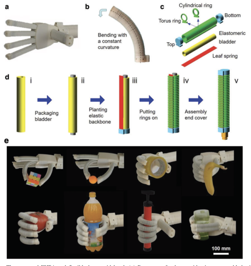 “新型的类人动物手设计是软硬混合柔性抓手。它可以产生比传统的纯软手更大的抓握力,同时比其他用于较重物体的手更稳定,可以进行精确的操纵。”