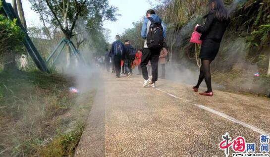 重庆两江新区礼嘉智慧公园,隐藏在道路两侧的红外线感知设备随时监测温度,用喷雾降温。