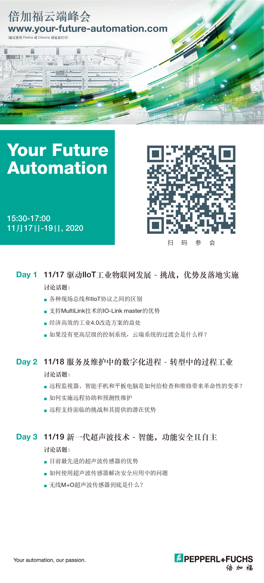 2020年11月17日至19日,倍加福将举行主题为“Your Future Automation (您的未来自动化)”第二届云端峰会,本次峰会将重点关注运营技术(OT)和信息技术(IT)的日益融合。活动完全免费、完全数字化,旨在为客户等各方提供全新数字化平台,获悉自动化领域的最新趋势和解决方案。敬请提前注册并预留您的时间。倍加福云端峰会,我们期待与您云端相聚!