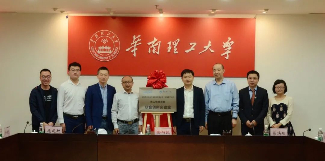 华南理工大学科技成果转化办公室副主任葛瑞明,优必选科技副总裁/研究院副院长庞建新、高校教育事业部总经理齐建伟、高校教育事业部南区销售总监魏来、高级工程师袁杰,华南理工大学电子与信息学院党委书记/优必选-华南理工“类人情感智能”联合创新实验室主任徐向民、电子与信息学院副院长余翔宇、联合创新实验室副教授青春美出席仪式并共同为联合实验室揭牌。