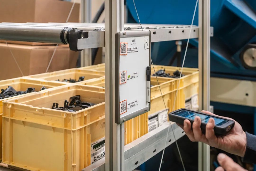 MiR200融入了仓库到生产线运送包装材料的流程,使这项工作实现了全自动化。现在,如果工人需要运送材料,就可以通过PDA设备和二维码呼叫机器人,二维码中包含了机器人前往材料存放位置所需的信息。机器人将驶向正确的仓库货架,自动将货物装到机器人货架单元上,然后机器人再前往需要运送材料的生产点。