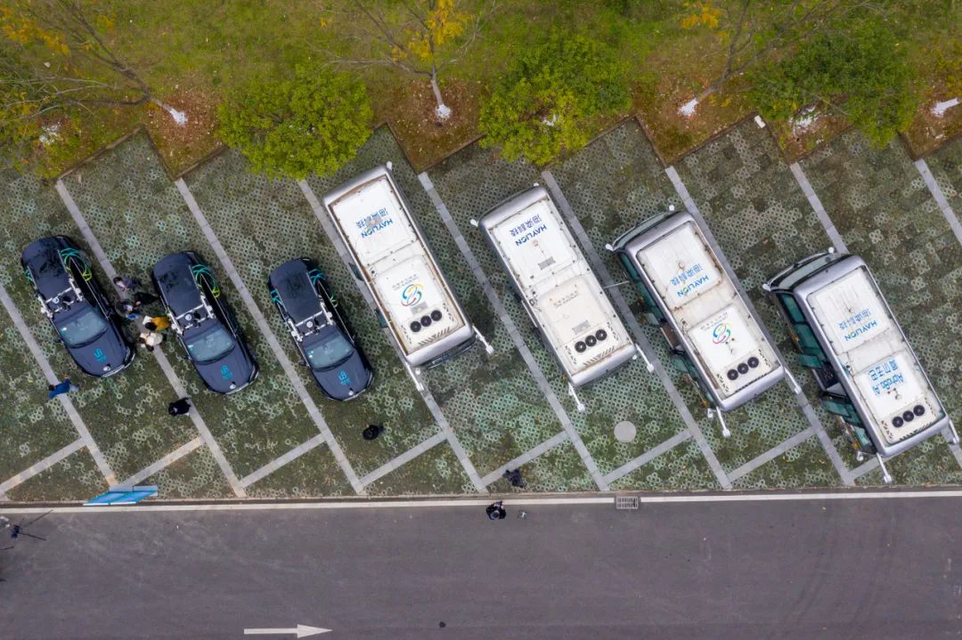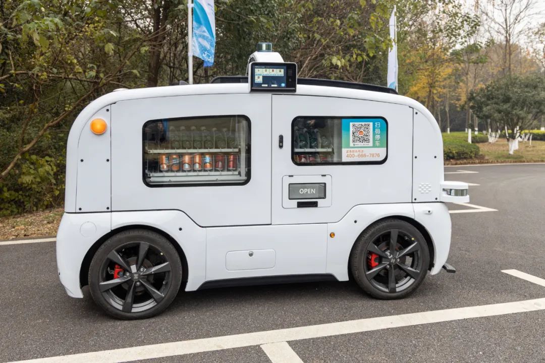 12月9日在环境优美的武汉经开区龙灵山生态公园19辆自动驾驶出租车、观光车、售货车、环卫车、穿梭巴士自由穿行期间无人驾驶观光车上游客们安心惬意地欣赏着沿途风景如果你渴了就挥挥手在无人驾驶售...
