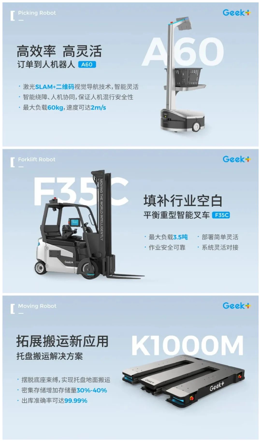 A60拣选机器人、F35C智能平衡重载叉车和托盘搬运解决方案