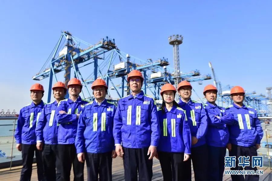 “连钢创新团队”成员在山东港口青岛港自动化码头上(3月28日摄)。新华社发