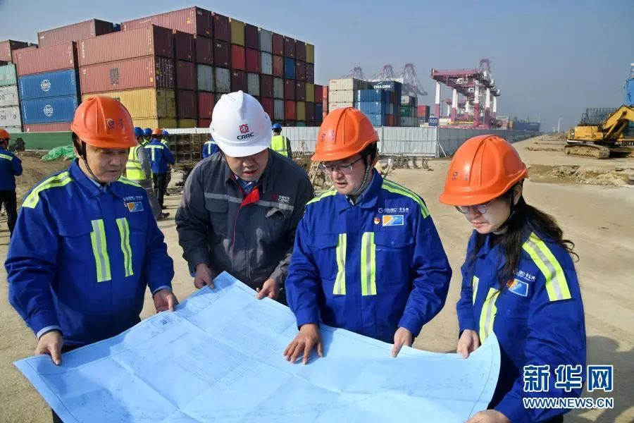 12月27日,“连钢创新团队”成员在山东港口青岛港全球首创的集装箱智能空轨集疏运系统建设工地上,与施工方研究优化施工方案。新华社记者 李紫恒 摄