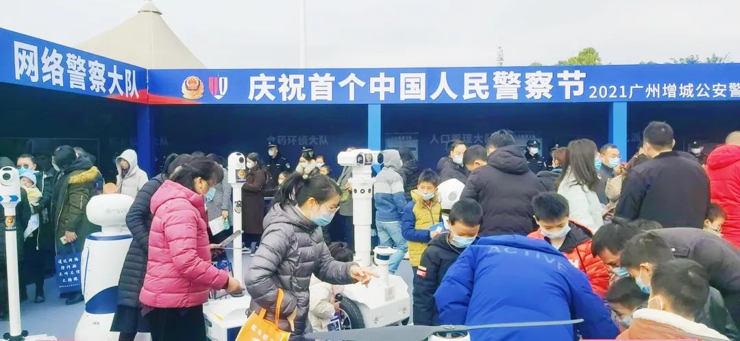 增城区活动分会场。2021年1月10日,增城区公安机关为庆祝首个中国人民警察节举办了2021广州增城公安警营开放日,高新兴警用巡逻机器人、5G稽查布控机器人、5G警用安保服务机器人等多台机器人在现场为街坊们普及安全知识。