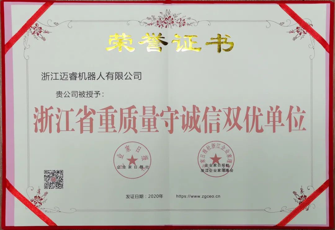 迈睿机器人自成立以来,始终围绕“诚信为本,匠心制造”的精神,潜心创新研发产品,诚信经营企业。此次荣获“浙江省重质量守诚信双优单位”荣誉称号,是对迈睿机器人这几年快速发展、产品品质、公司品牌及诚信经营的认可;同时也激励迈睿机器人积极发挥榜样、示范作用,也是一份光荣的责任。
